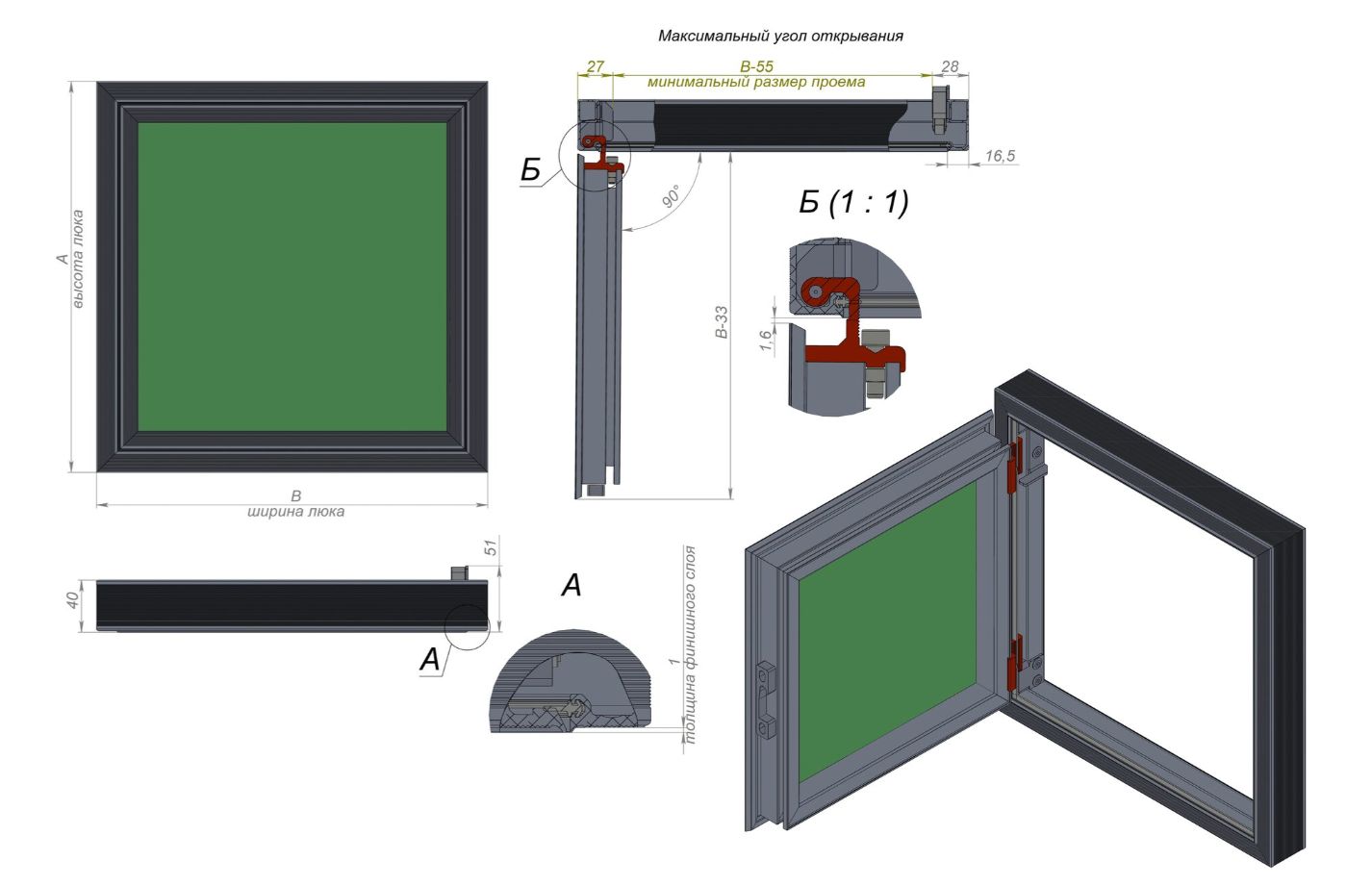 Данная модель люка имеет возможность снятия двери, что облегчает установку люка в проём.