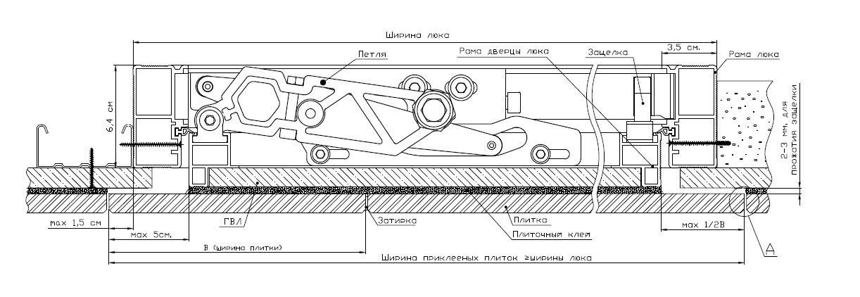Предварительные работы. Проем люка очистить от остатков плиточного клея, пыли и другого мусора. Проем должен быть твердым, края не должны осыпаться. В направляющих пазах подшипника также не должно быть никакого мусора. Стороны проема должны соответствовать геометрической форме люка. Размер проема должен быть на 2-3 мм больше посадочного размера рамы люка.